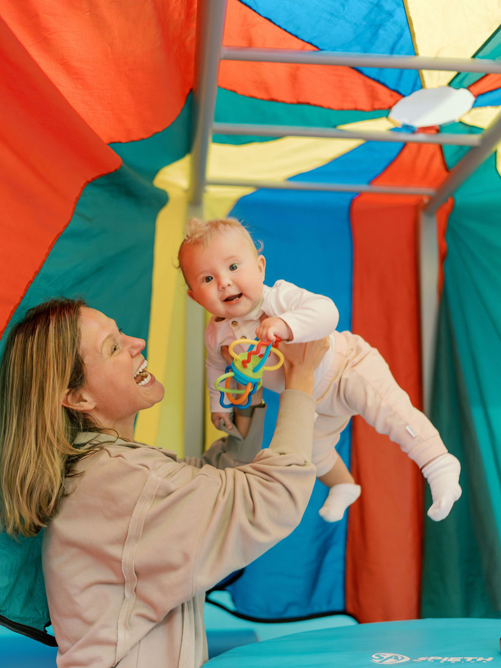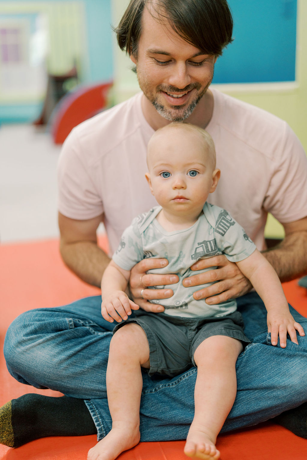 At Romp n’ Roll, our dedicated instructors are here to guide you and your baby as they embark on their journey to achieve critical developmental milestones. Our classes offer a delightful blend of learning and play, where you’ll engage in activities designed to support your baby’s core, neck, and back strength. With the aid of padded airlogs, you’ll have a blast while enhancing body awareness and encouraging language development through sign language during engaging storytime sessions. As your baby becomes more mobile, our well-designed padded stairs, ramps, and equipment cater to their evolving needs, facilitating the development of essential skills. Our babyproof and meticulously maintained environment ensures a safe and joyful space for both you and your baby to learn, explore, and grow together.
