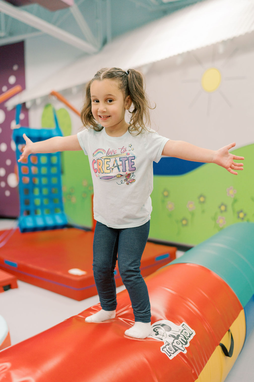 At Romp n’ Roll, our proprietary music program, Tumble Tunes™, offers a unique and engaging experience for young children. Utilizing a soundtrack of music unique to Romp n’ Roll, we integrate music and movement, using our gym equipment along with musical instruments like egg shakers, rhythm sticks, tambourines, drums, and more. This dynamic approach creates a one-of-a-kind class that develops gross and fine motor skills, socialization, and rhythm and melody, the foundations of music.